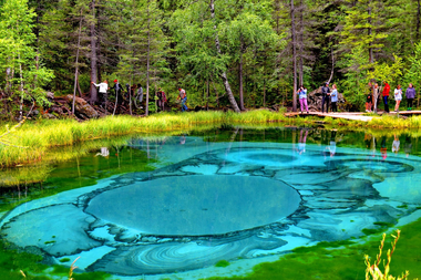 Гейзеровое озеро (Голубое озеро, Серебряное озеро). Глубина озера — около двух метров, диаметр — примерно 25-30 метров. В озеро впадает довольно большой ручей. Гейзеровое озеро единственное в своем роде — редкое по красоте, чистое, незамерзающее даже зимой. Это всегда открытый в Космос «земной глаз» удивительного бирюзового цвета. На зеркале озера можно заметить разводы округлой или овальной формы, которые по сути лишь отражение процессов, происходящих на дне озера. Там, в таинственной глубине, время от времени оживают «гейзеры», выбрасывая на поверхность смесь голубоватой глины и песка, которые формируют на дне озера видимые концентрические окружности. Вы можете оказаться тем счастливчиком, который будет присутствовать при «извержении» и запечатлеет происходящее на фотоаппарат.